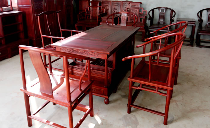 江蘇中尊木業(yè)有限公司書房系列產品:書房五件套草龍書柜、草龍大班枱、卷書寶座椅,洋花寫字枱等。